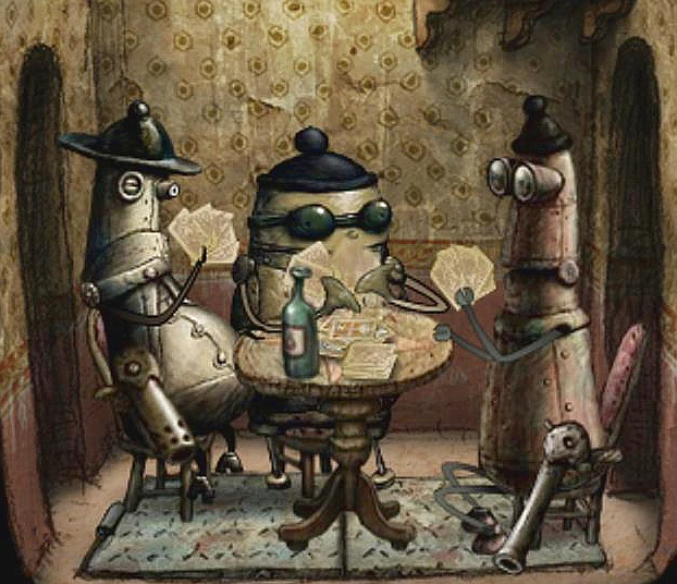 The Black Cap Brotherhood are like gangsters and often cause trouble in the City. They have a hideout behind the Pub in a room where they drink and gamble at cards. They also have a secret jail in the Docks area where they construct the Bomb for their plot to take over the City. They plan to destroy the Castle where the Mayor of Machinarium governs and looks after the City. They all wear black headgear as a sign that they belong to the brotherhood.