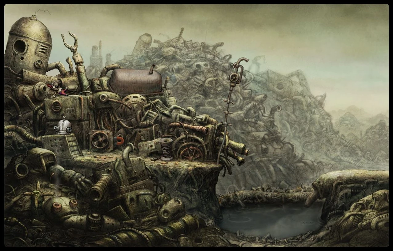 Josef is a small friendly robot living in an old decaying city full of strange and unusual robots. He had a girlfriend named Berta that he used to spend many hours with. They would play paintball, go swimming, share birthdays or just sit together. Josef and Berta used to help the Mayor of Machinarium in the Castle tower. It was on such an occasion that the leader of a group of gangsters called the Black Cap Brotherhood ruined Josef’s happy life. The Black Cap Leader entered the Castle and disabled the mayor but the mayor was just quick enough to press the emergency button to call the security guards. The Flying Security Robot arrived and the Black Cap Leader tried to make his escape but the Flying Security Robot attempted to capture the Black Cap Leader. In a cruel twist of fate the Flying Security Robot captured Josef instead and took him off to the Junkyard. The Castle Guard then arrived in his helicopter which was the cue for the Black Cap Leader to make a hasty retreat; on the way out he picked up Berta and made off with her. He enslaved Berta in the Kitchen of the Black Cap Brotherhood’s hideout, to cook for them. Josef must now find a way back into the city, rescue Berta, save the Mayor of Machinarium and defeat the Black Cap Brotherhood.